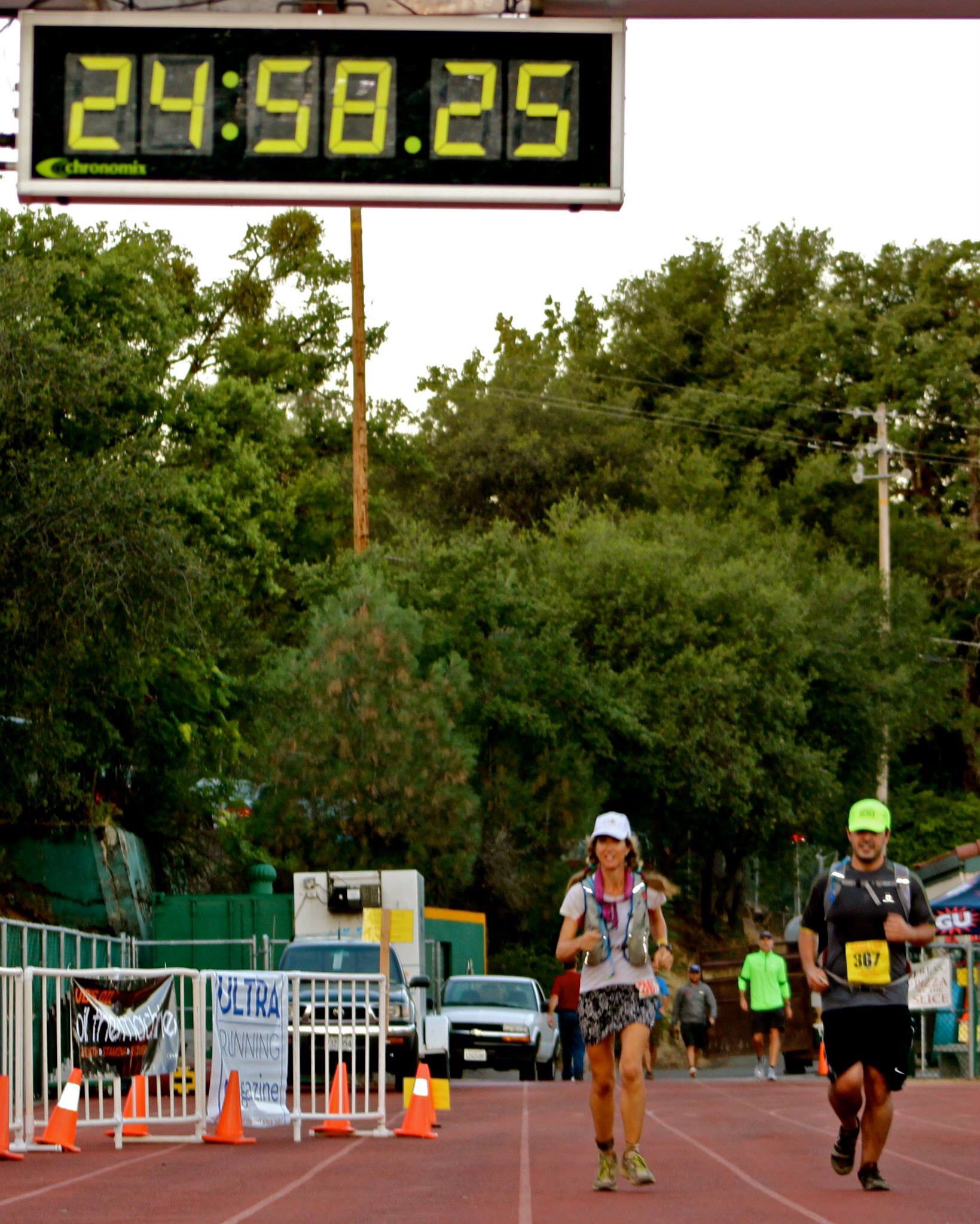 The stadium appears. I have dreamed of this moment since December and start running around the track, breaking into an all-out sprint that on the video turns out to be a shuffling jog. The finish line clock says 24:58. Less than an hour off my dream goal. David beams from behind his camera. I collapse on the grass, happy, exhausted, exhilarated, and drained of all reserves. One of the most grueling and wonderful days of my life is over. I cannot wait for the next chance at the silver buckle.
